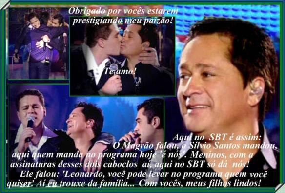 Leonardo? *L* É porque onde quer que a gente chegue a gente tem luz própria... (rindo, sempre brincalhão). Vou é ter o prazer de mostrar aqui no SBT, para o Brasil inteiro, uma hora de sucessos de Leandro & Leonardo, do Leonardo, e com certeza vai ser muito legal. Leonardo sempre leva muita alegria onde quer que vá e pode até parecer que não leva nada muito a sério. Mas quem o vê caminhando para o palco percebe sua responsabilidade e seriedade até mesmo para um ensaio e vê o quanto ele se transforma naquele momento em que a presença do irmão Leandro parece muito forte, sempre o acompanhando. Segue tenso, mas chegando ao palco é novamente alegria, espontaneidade, segurança, domínio.